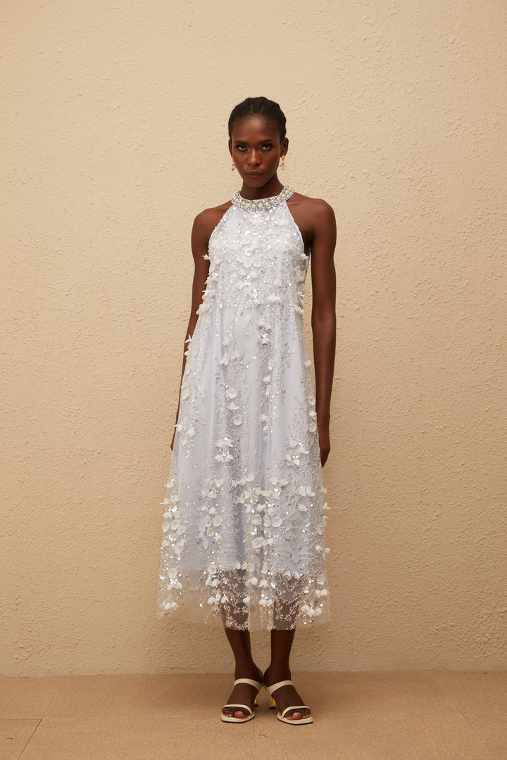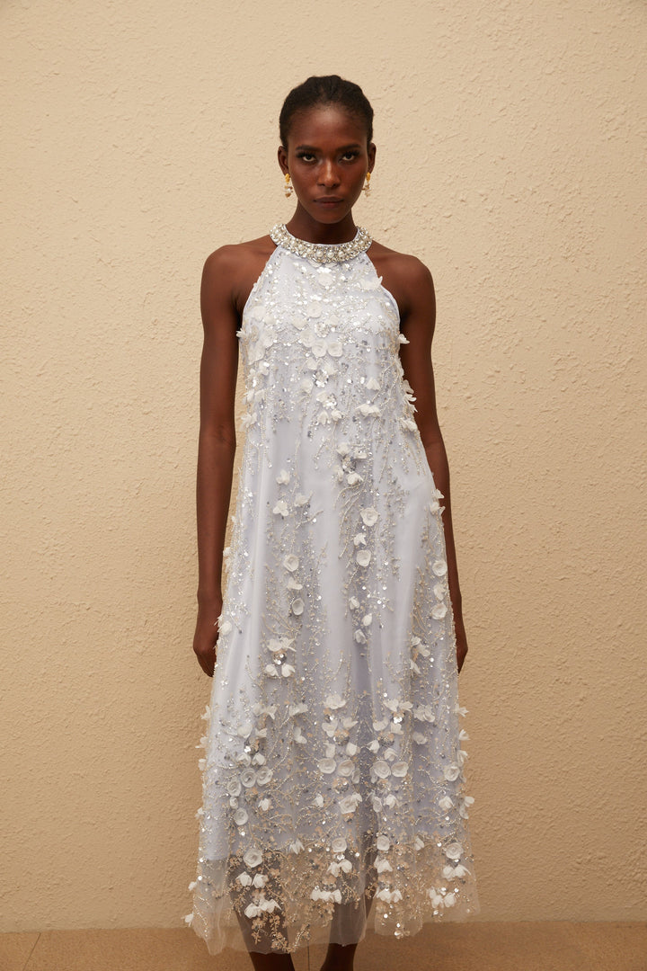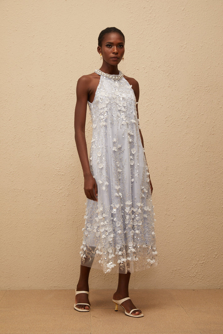 Quitterie Blue Embellished Floral Tulle Midi Dress