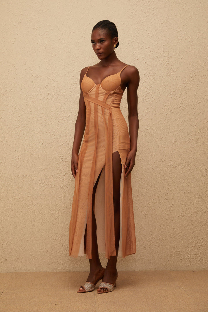 Roxane Brown Asymmetrical Tulle Maxi Dress