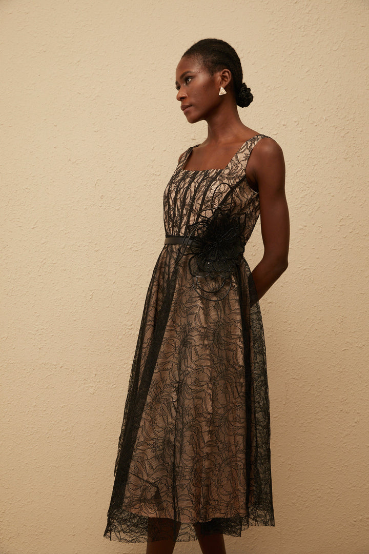 Sandrine Black Floral Lace Midi Dress