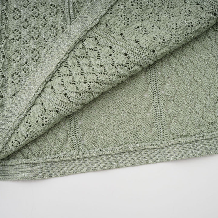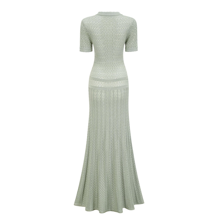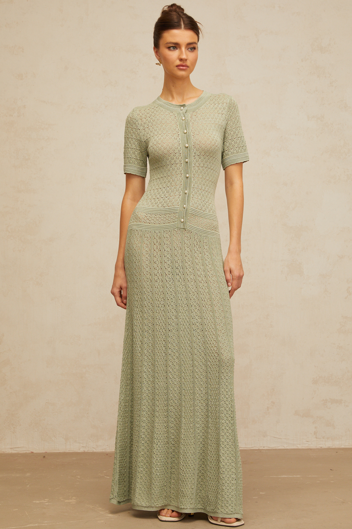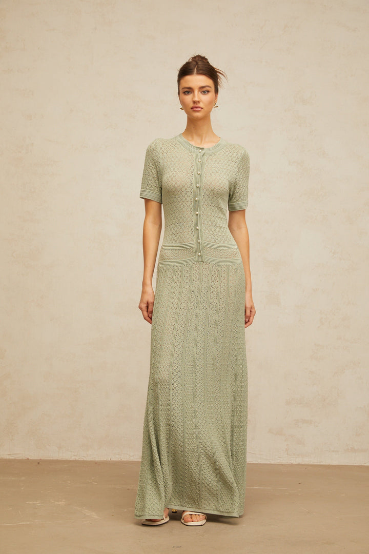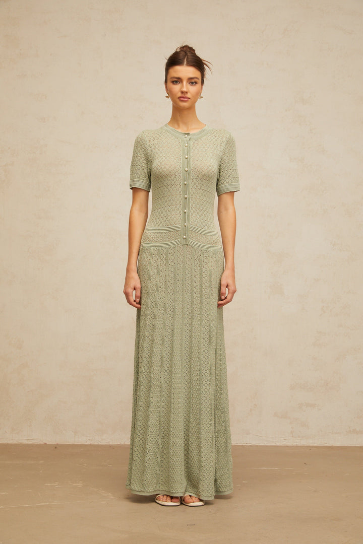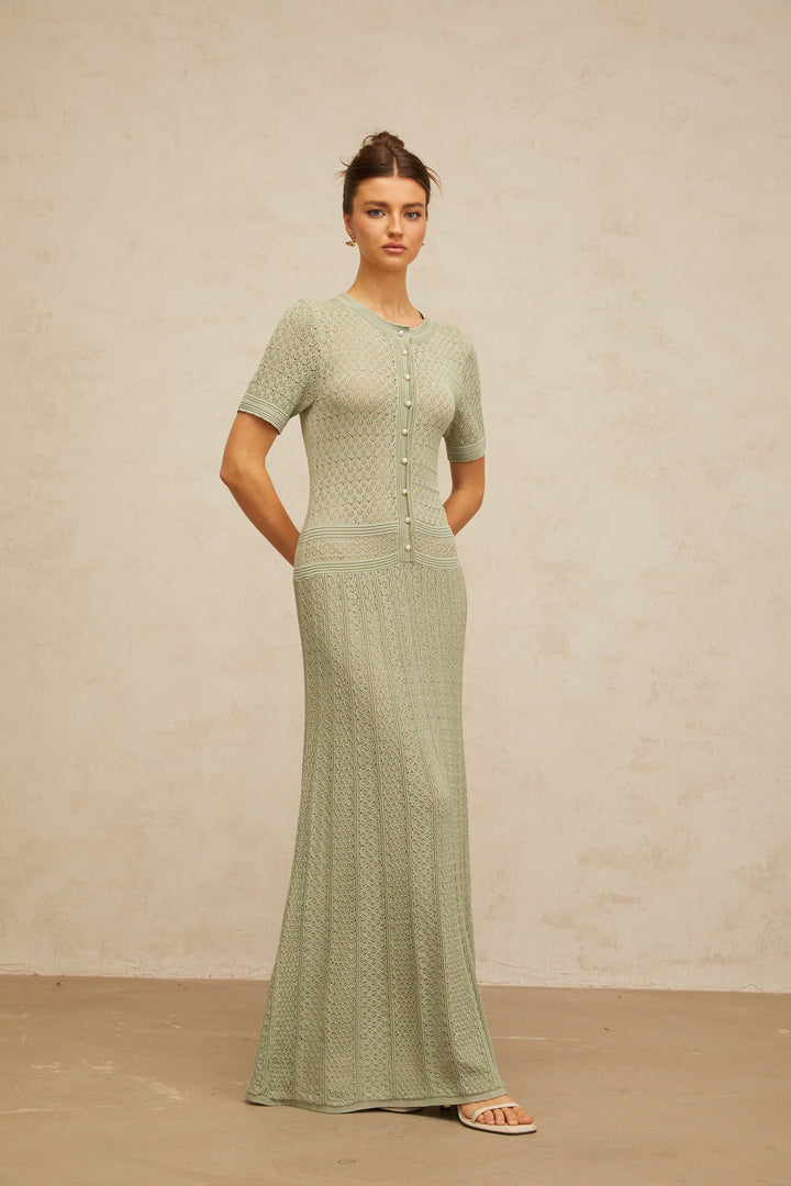 Siena green shirred crochet-knit maxi dress