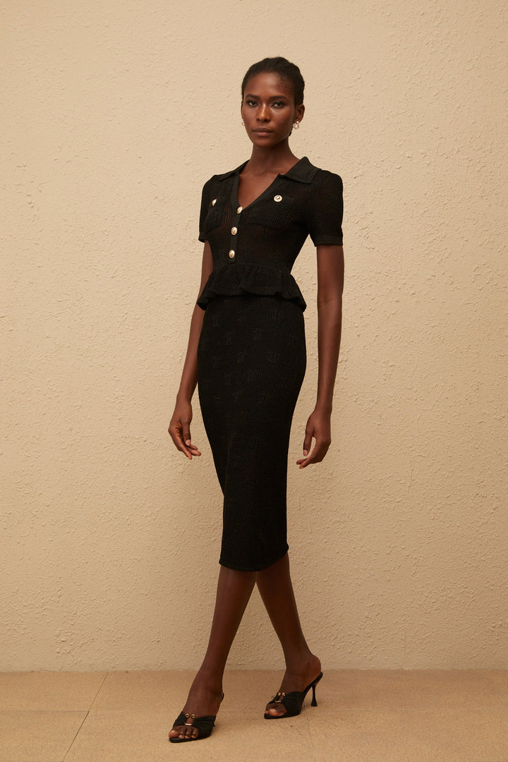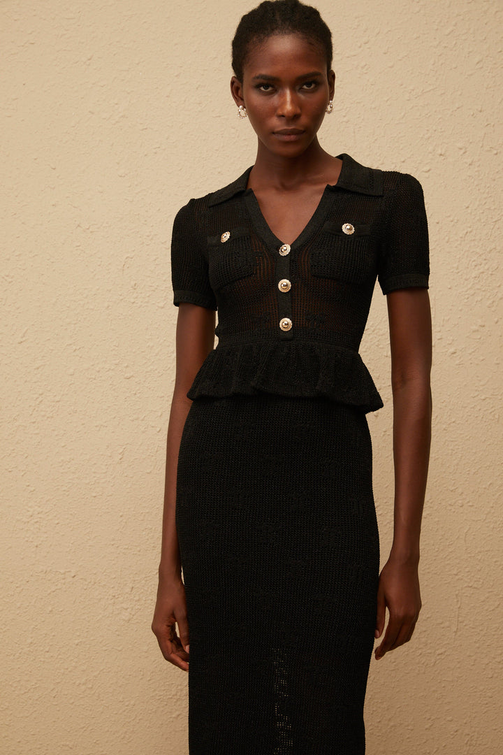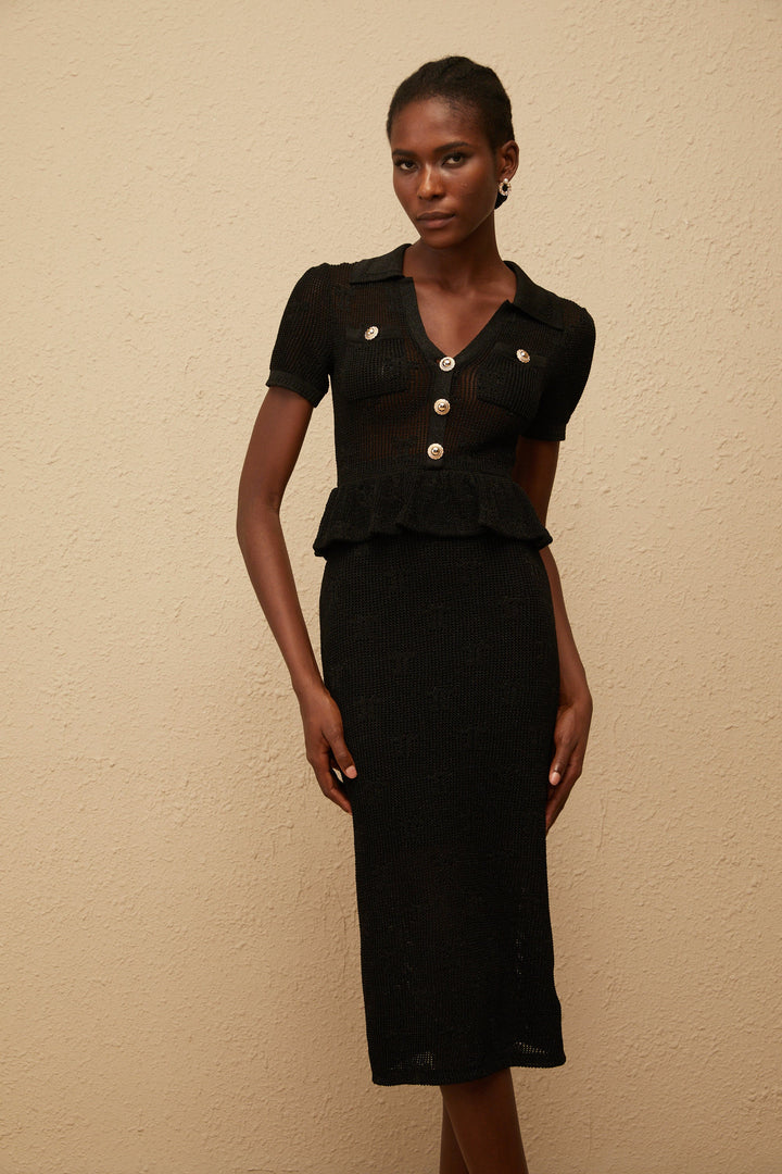 Theodora Black Crochet Knit Midi Dress