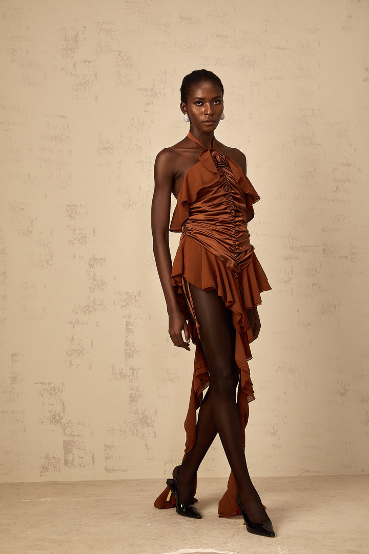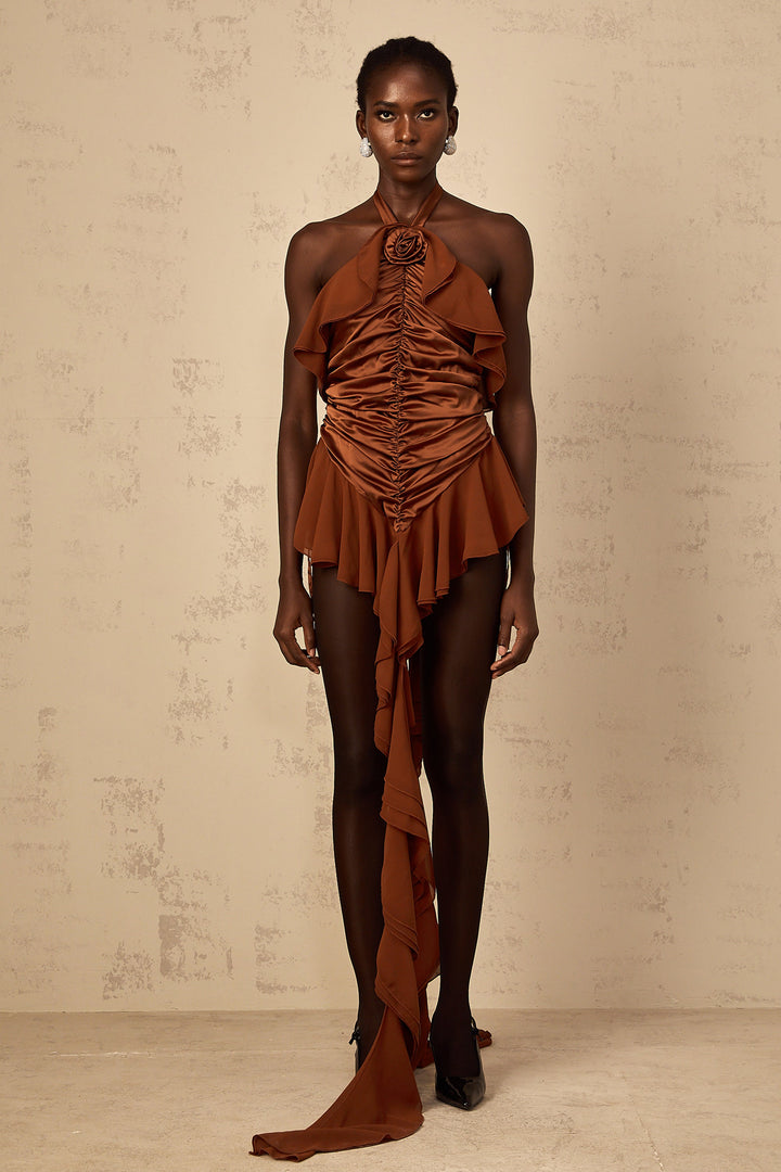 Léonie brown floral-appliqué ruched mini dress