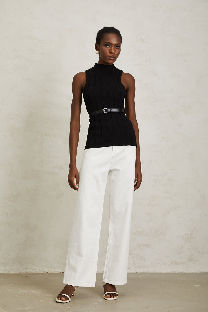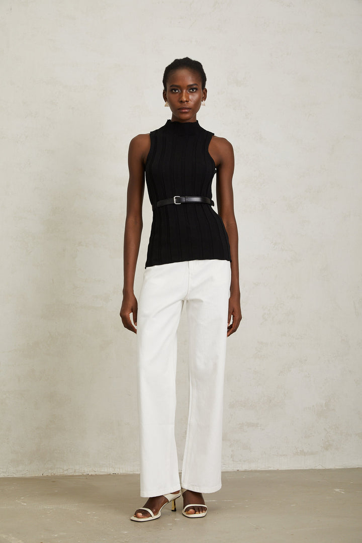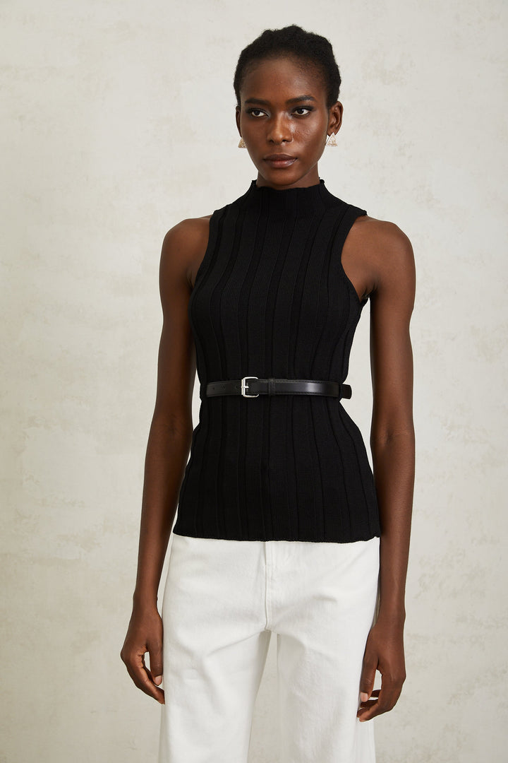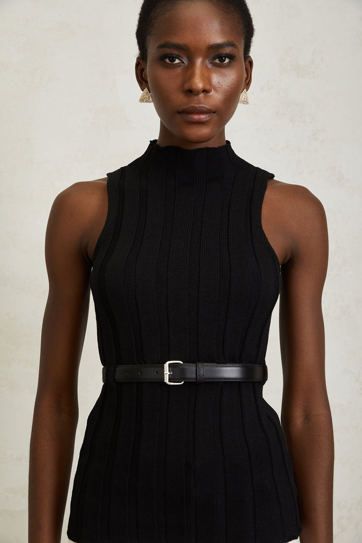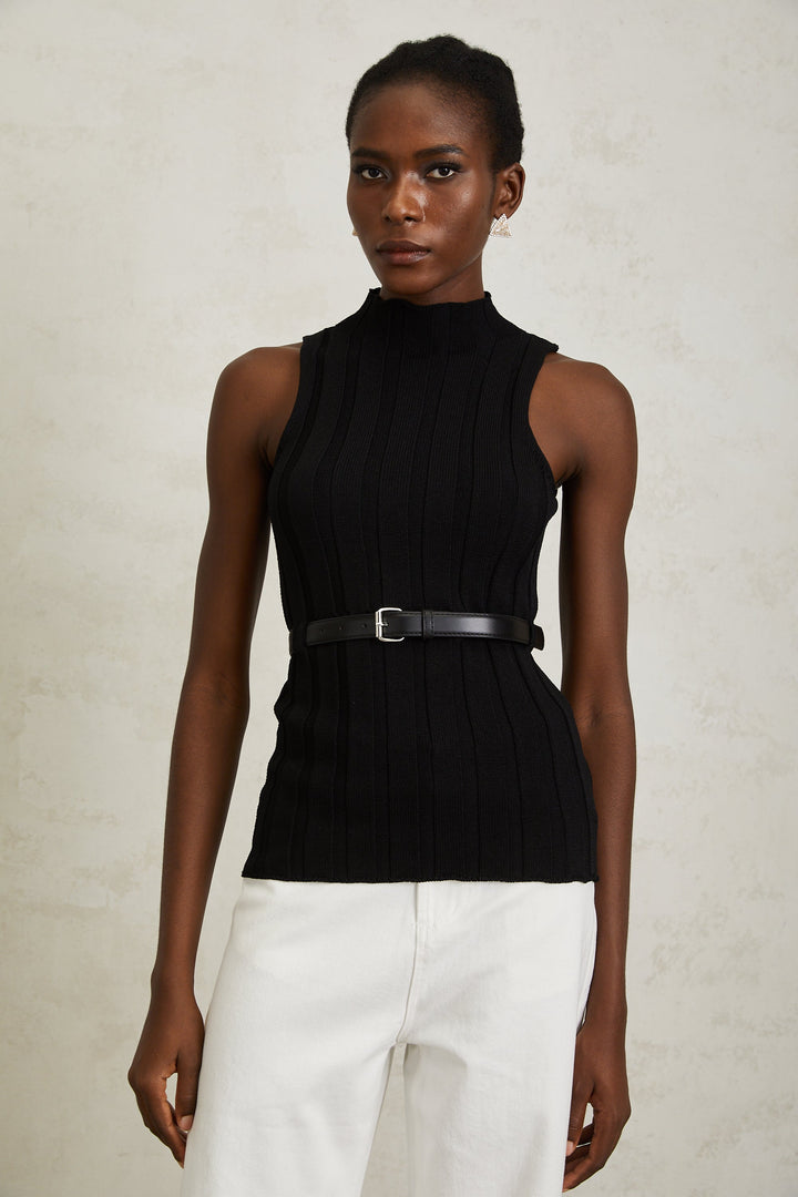 Maelle Black Belted Ribbed Knit Top