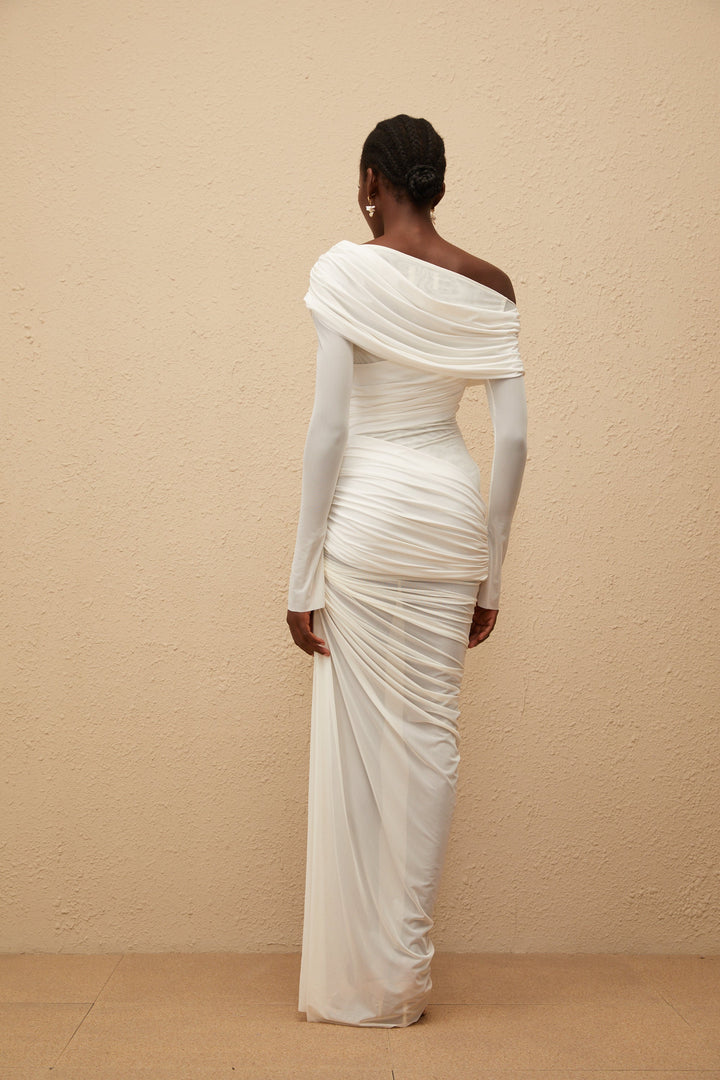 Melanie White Asymmetrical Ruched Mesh Maxi Dress