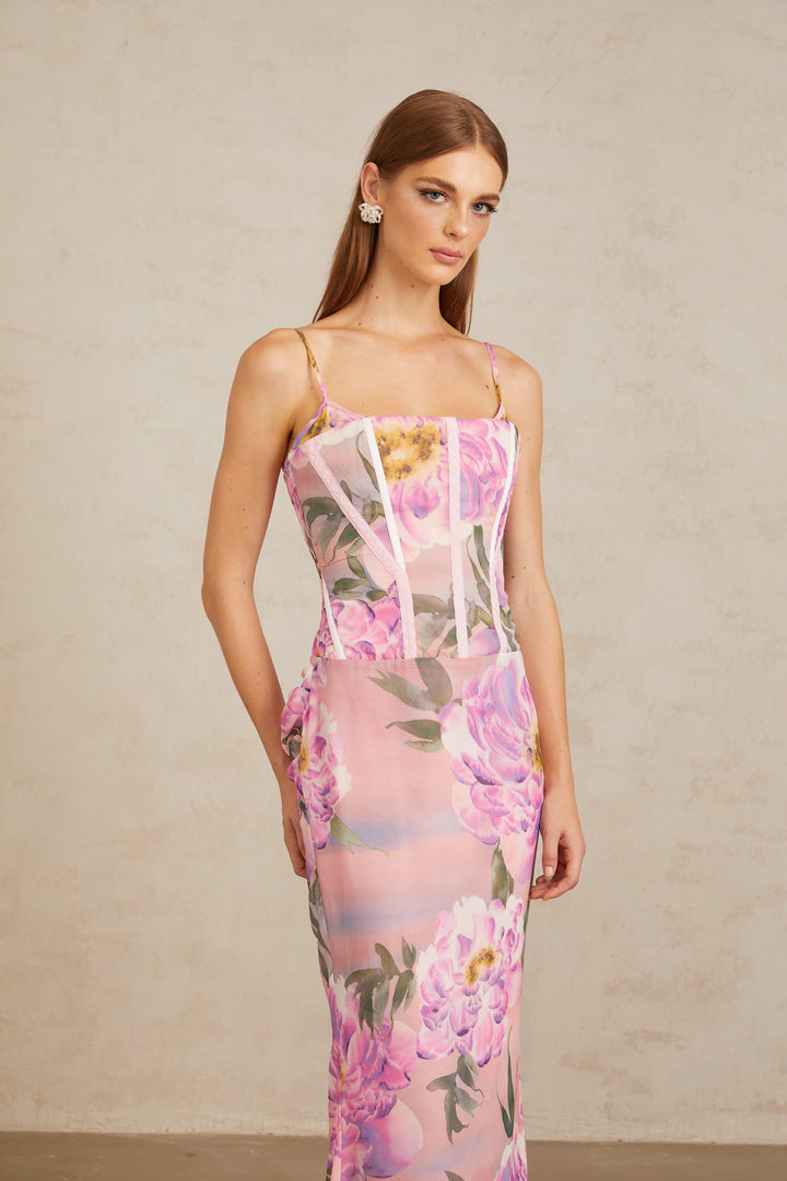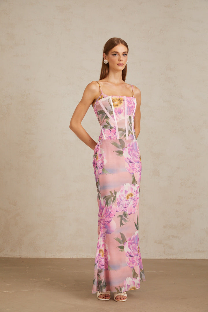 Irène Pink Chiffon Floral Print Maxi Dress