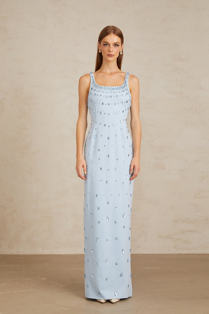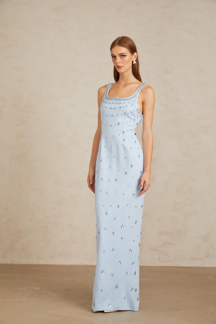 Meris Blue Crystal Embellished Maxi Gown