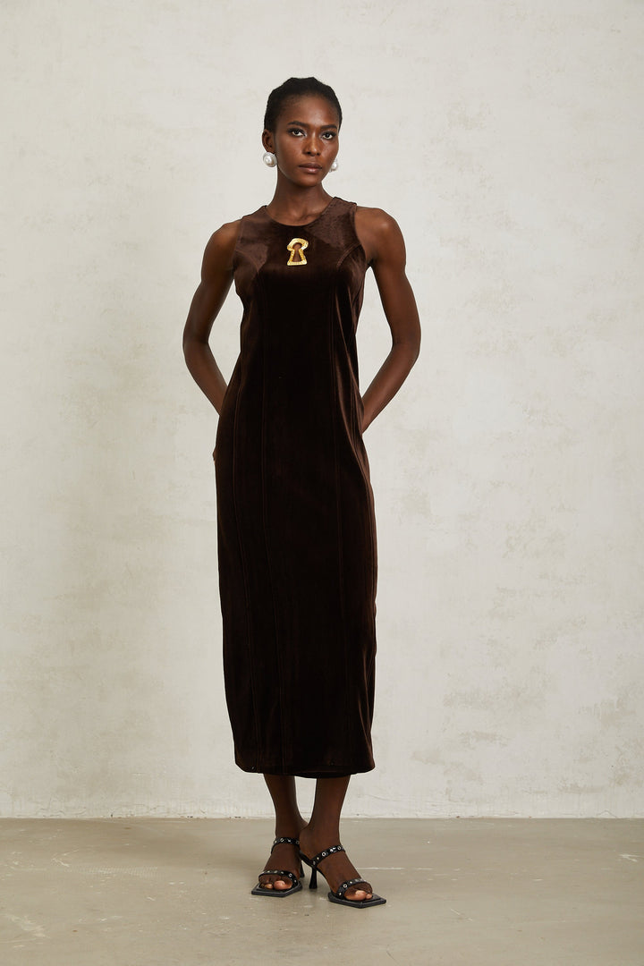 Ysandre Brown Keyhole Velvet Midi Dress