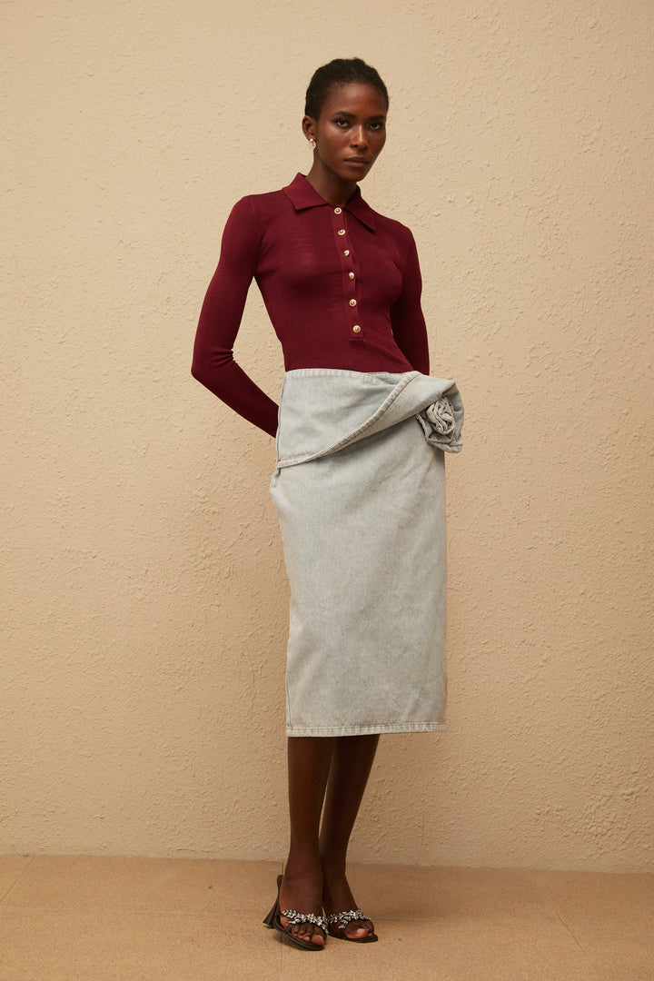 Zélie Blue Floral Appliqué Denim Midi Skirt